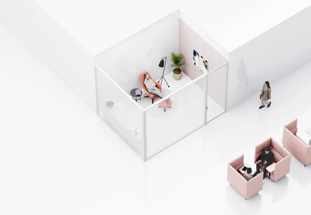 - A private space that allows employees to focus in a relaxed posture, supporting concentration in a calming environment