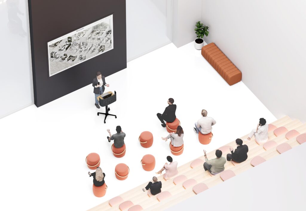 - Ideal for informal meetings and internal learning sessions with 10-50 participants, combining a dynamic setting with presentation-friendly functionality