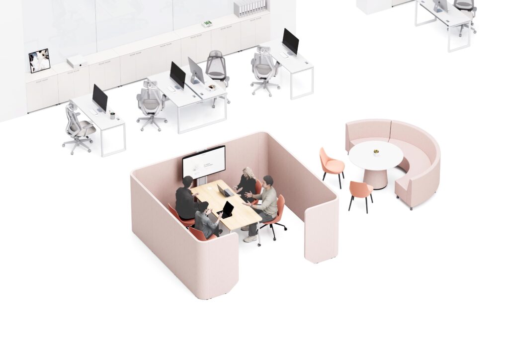 - Ideal for 2-4 people to engage in impromptu discussions efficiently, in a semi-private setting that balances accessibility and focus