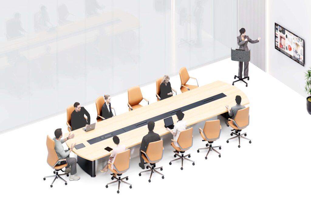 - The curved conference table designed to face the same direction enhances visibility and engagement, ensuring an equal viewing experience for all participants, both onsite and remote