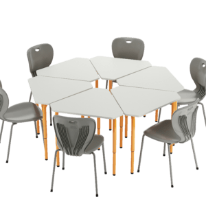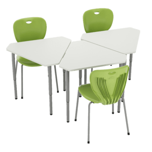Diamond Desks allow great flexibility when it comes to creating compact pods of two, three and four students. The flexibility comes from the shape of the desktop. Its pie shape allows four students to work in a very compact area. Its space-saving desktop provides ample workspace and allows it to create compact groups of six.