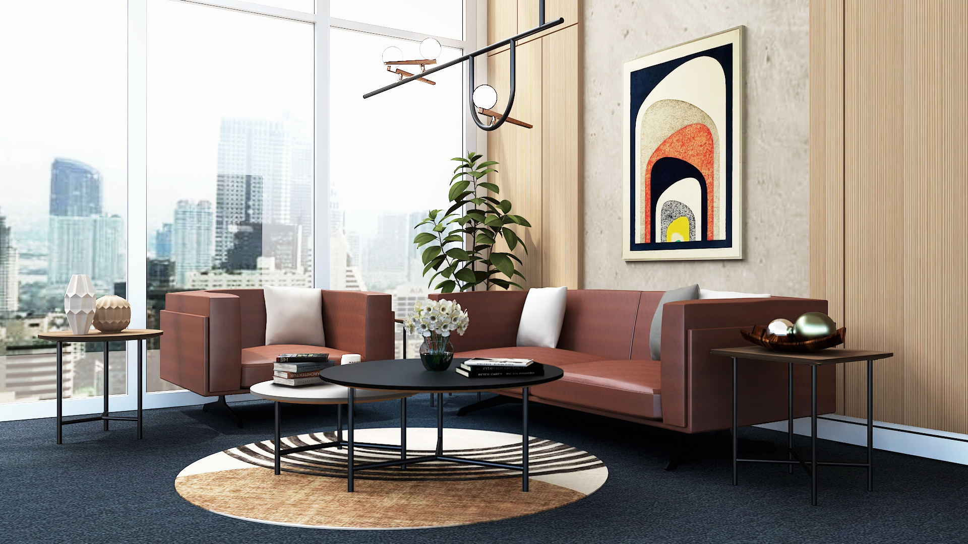 MIRA, nesting coffee table. Lightness and simplicity. The slender support frame with its shape and finish,the rounded support of powder coated steel supporting the tops in different shapes, round, oval, square and triangle. Various shapes and heights make it possible to compose different support systems. The tops themselves, made of several finishes, have a fine thickness of 12 mm edging.