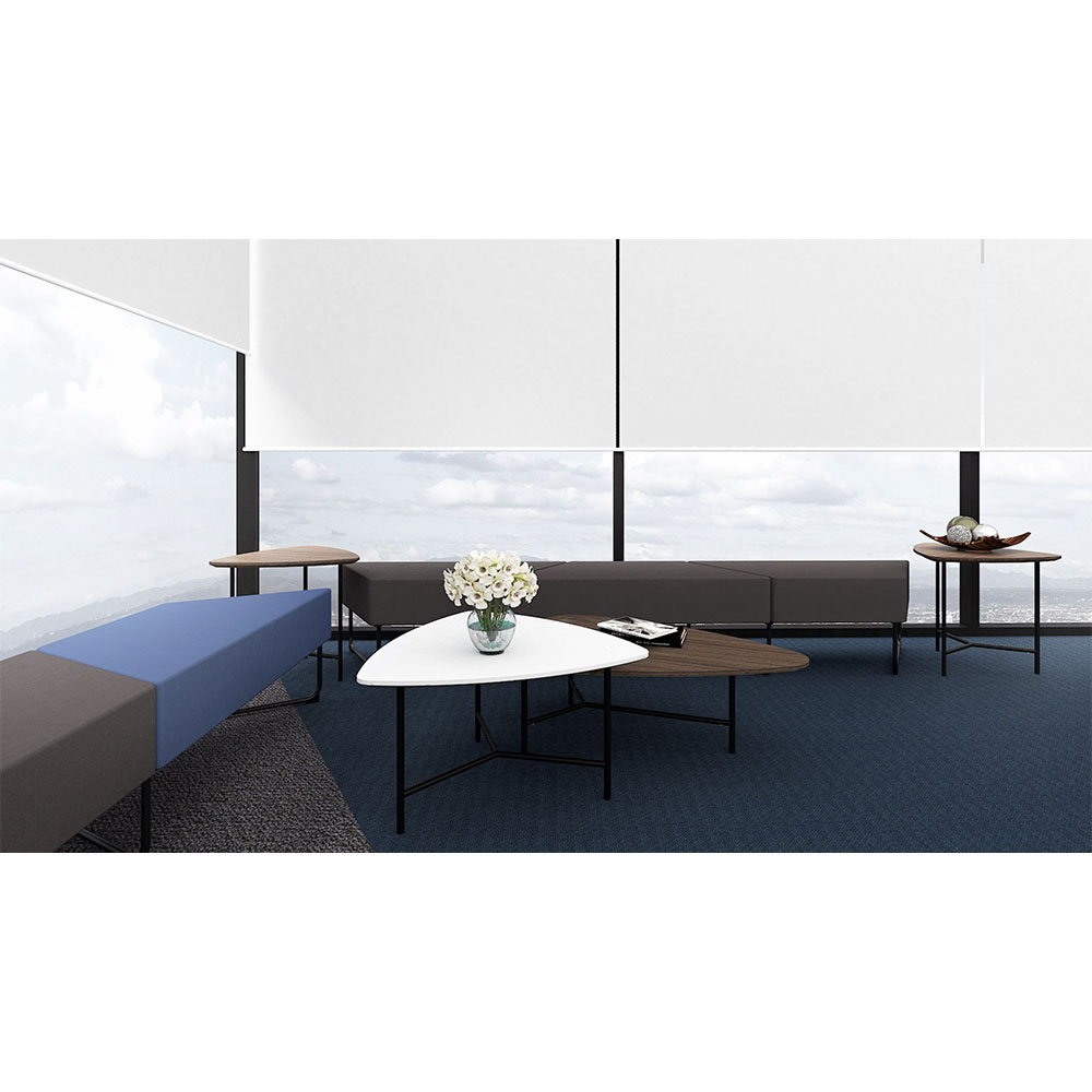 MIRA, triangle side table. Lightness and simplicity. The slender support frame with its shape and finish, the rounded support of powder coated steel supporting the tops in different shapes, round, oval, square and triangle. Various shapes and heights make it possible to compose different support systems. The tops themselves, made of several finishes, have a fine thickness of 12 mm edging.