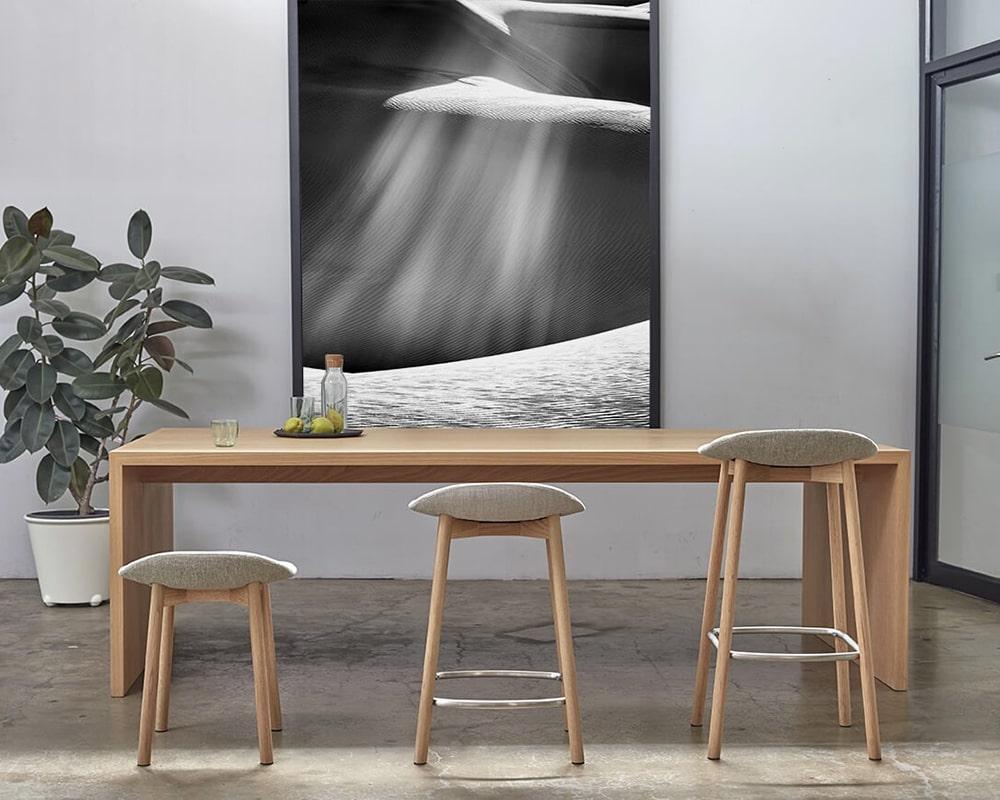 PRIMO, four wooden legs stool is available in 3 heights, low, medium, high stools. Legs can choose in Oak, Ash or Beech of solid wood finishes and the seat can be upholstered in wide range of our selection.