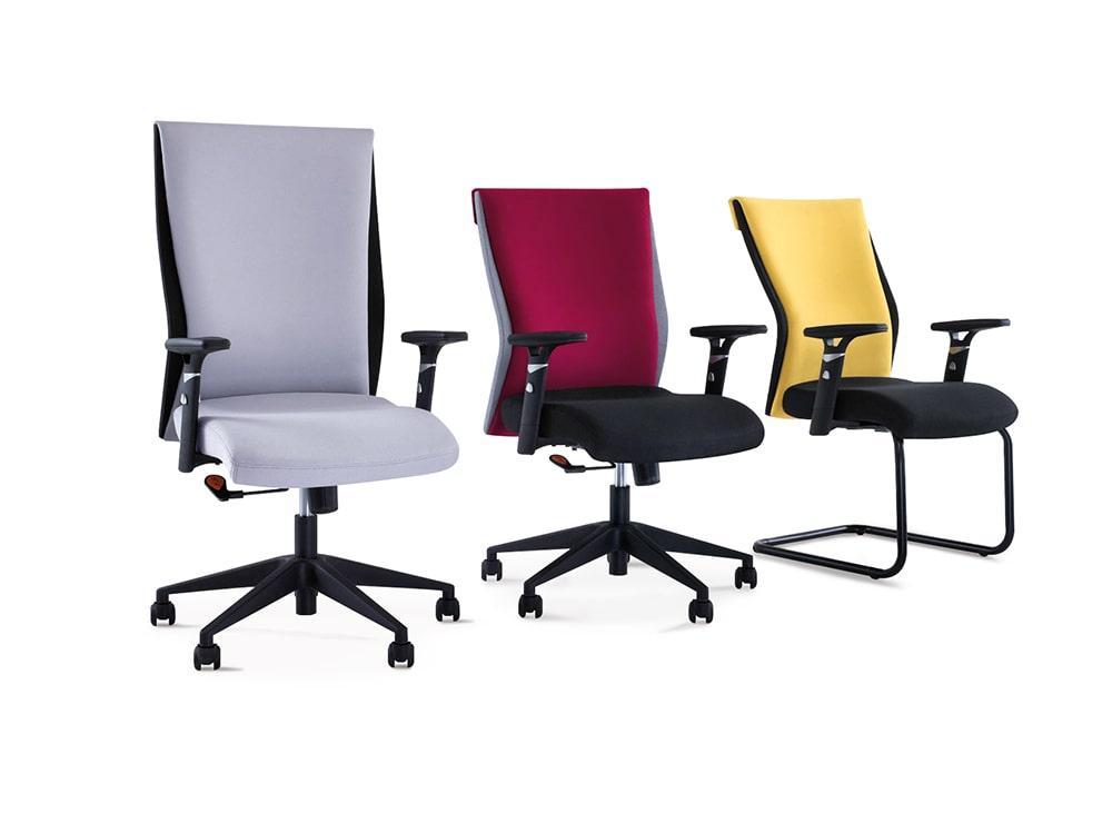 RIO is a fully upholstered, ergonomic swivel chair. The fabric on the back support makes it ideal for working in modern office spaces as well as at home, and it adds a splash of color to any room. The availability of dozens of fabric patterns, as well as the ability to combine two colors on one chair, allows for virtually limitless arrangement possibilities. The simple and intuitive mechanisms allow allow the user to sit dynamically and provide comfort during a long day at work.
