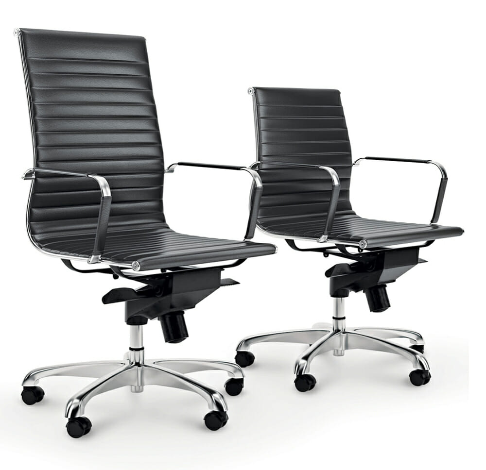 Slim design while maximizing coziness and relaxation with aesthetic genuine leather vinyl or mesh. Chrome fixed armrests with leather or vinyl sheath for elegant design. Full leather, vinyl or mesh back and seat feature topstitching details.Curved backrest with sleek and slim design. Sturdy brushed aluminum alloy base makes elegant and exclusive look.