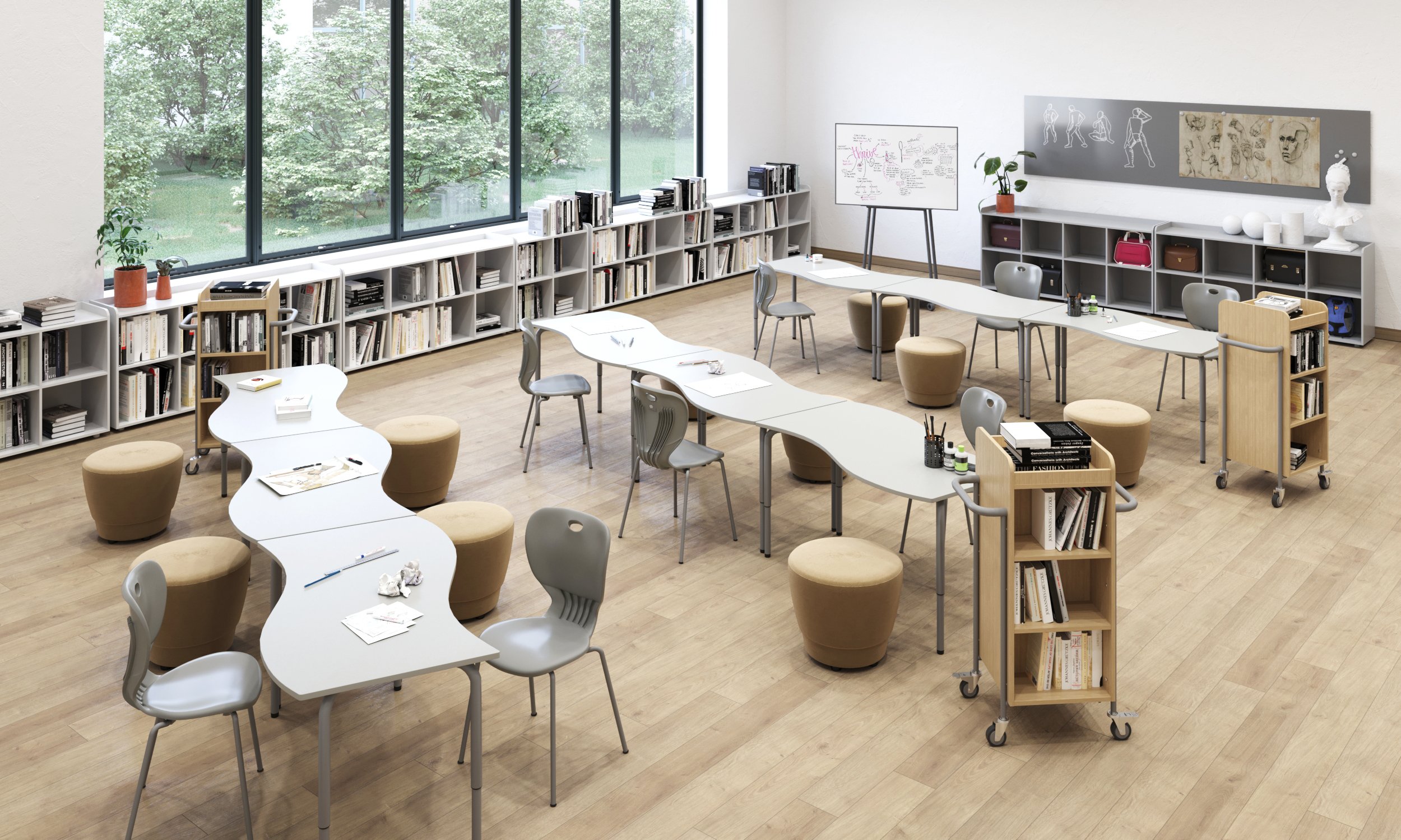 Squiggle Table has an elegant curvilinear shape that when nested together create visually stimulating collaborative space. These collaborative tables are a fun alternative to large rectangle tables when furnishing large spaces.