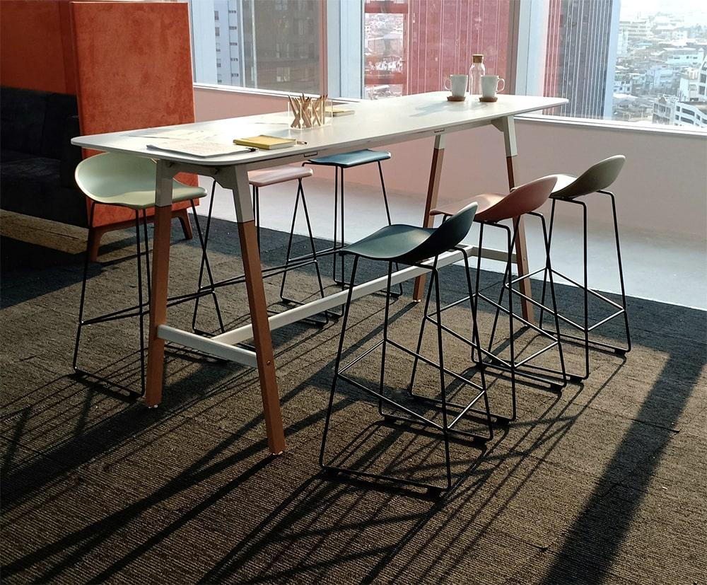 WINNIE high stool, ranging from a minimalistic plastic stool to a more full-bodied upholstered version. The curved backrest is balanced on an elegant rounded frame in steel, showcasing a more industrial design with a strong visual presence. Suitable for using as a bar stool. Available in 3 colours in plastic and upholstery options.